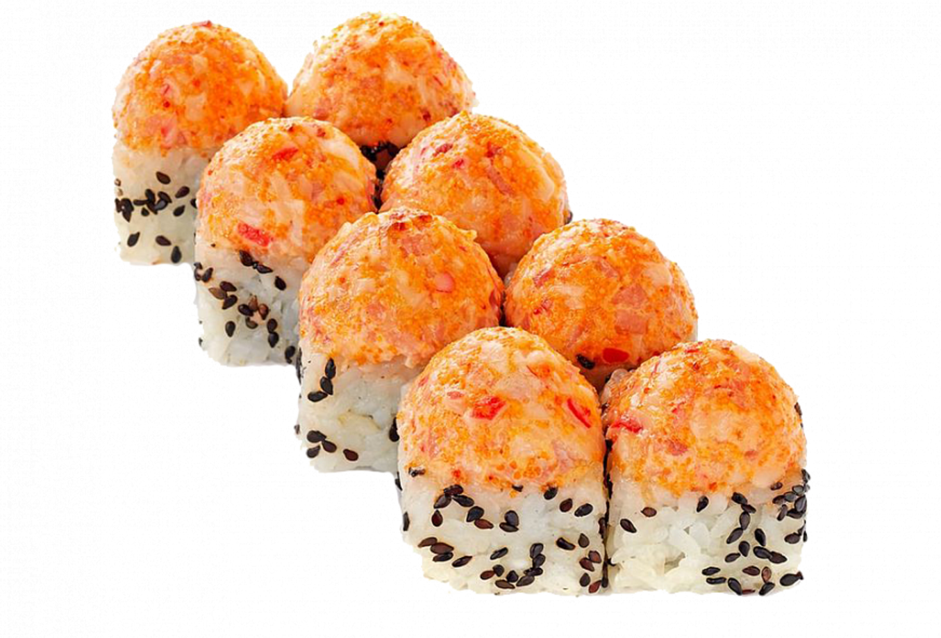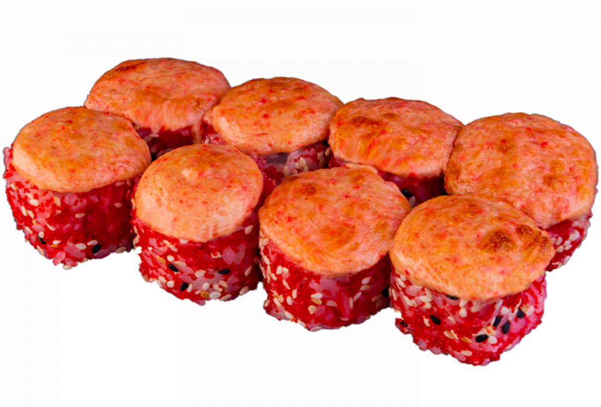 Рис, нори, огурец, снежный краб ( имитация), масаго красная, кунжут, сыр моцарелла, майонез.