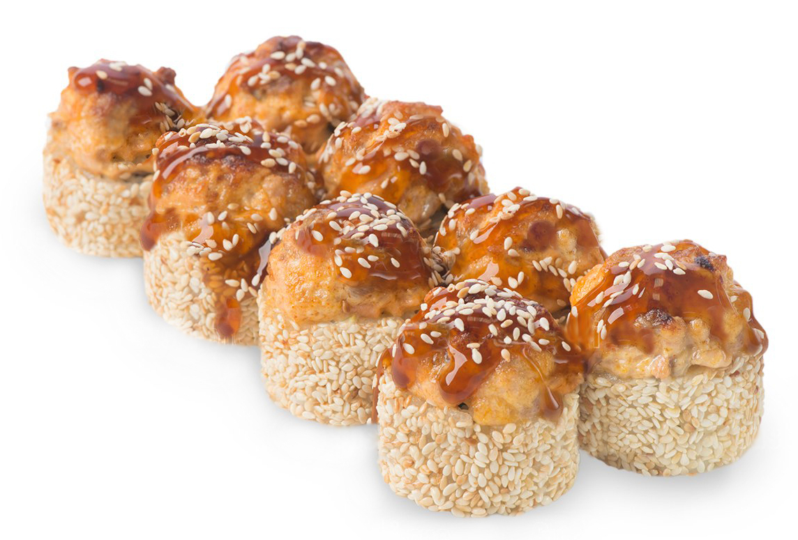 Рис, нори, сыр творожный, огурец, лосось, сыр моцарелла, майонез, соус унаги, кунжут.